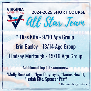 One of our Harrisonburg Gators were named as part of the 2024-25 Virginia Swimming All Star Team list for the short course season: Elias Kite. To qualify for the All Stars team, swimmers must finish the season with one of the top 5 fastest times in the LSC in any event in their age group. (*Harrisonburg Gators) Several additional swimmers ranked in the top 10 for their age group and are called out below. Erin Baxley ranked 2nd in the 13/14 Girls 200 Back (SCY), 5th in the 200 Fly...