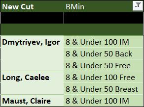 There were 47 legal swims. Of the 47 races 11 were first time swims. Of the remaining 36 swims, 78% were best times! In total there were 114 dropped seconds with an average drop of 7% per race. Great stuff! There were also 5 new 9-10 B time cuts achieved. Those swims and swimmers are called out in the graphic below.