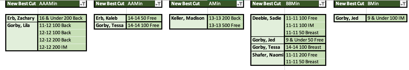 There were three swimmers that made finals in nine events, with five top 10 placements - Zachary Erb in the 50 Breast, 100 Breast, 200 Breast (6th), 200 IM, and 200 Back; Lila Gorby in the 100 Back (10th) and Kaleb Erb in the 50 Breast (6th), 100 Breast (7th), and 200 Breast (7th).