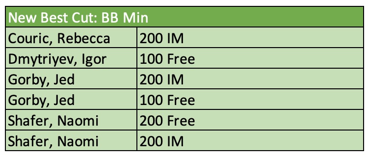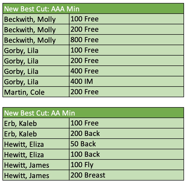 There were 31 new motivational cuts achieved from B through AAA. Those swims and swimmers are called out below. Great meet, everyone!! We hope you all had fun and were encouraged by your times over the course of the weekend and can't wait to see your end-of-season swims at both Age Group and Senior Championships in July!