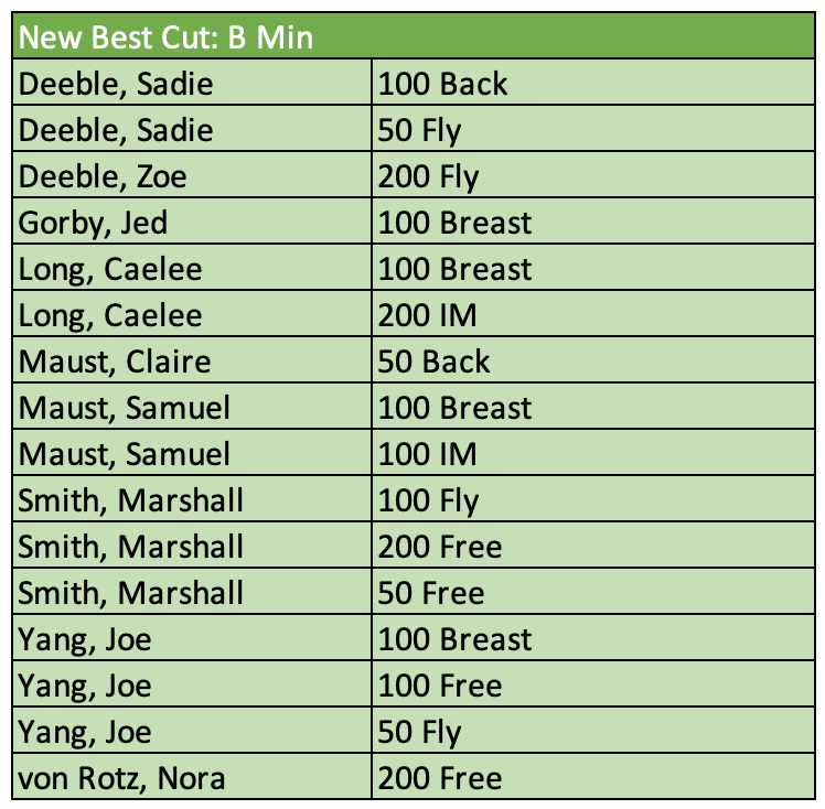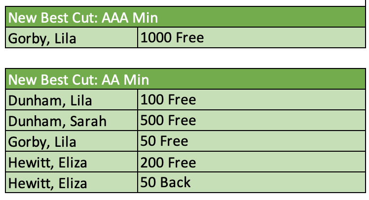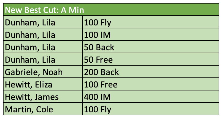 There were 45 new motivational cuts achieved from B through AAA. Those swims and swimmers are called out below. Great meet, everyone!! We hope you all had fun and were encouraged by your times over the course of the weekend.