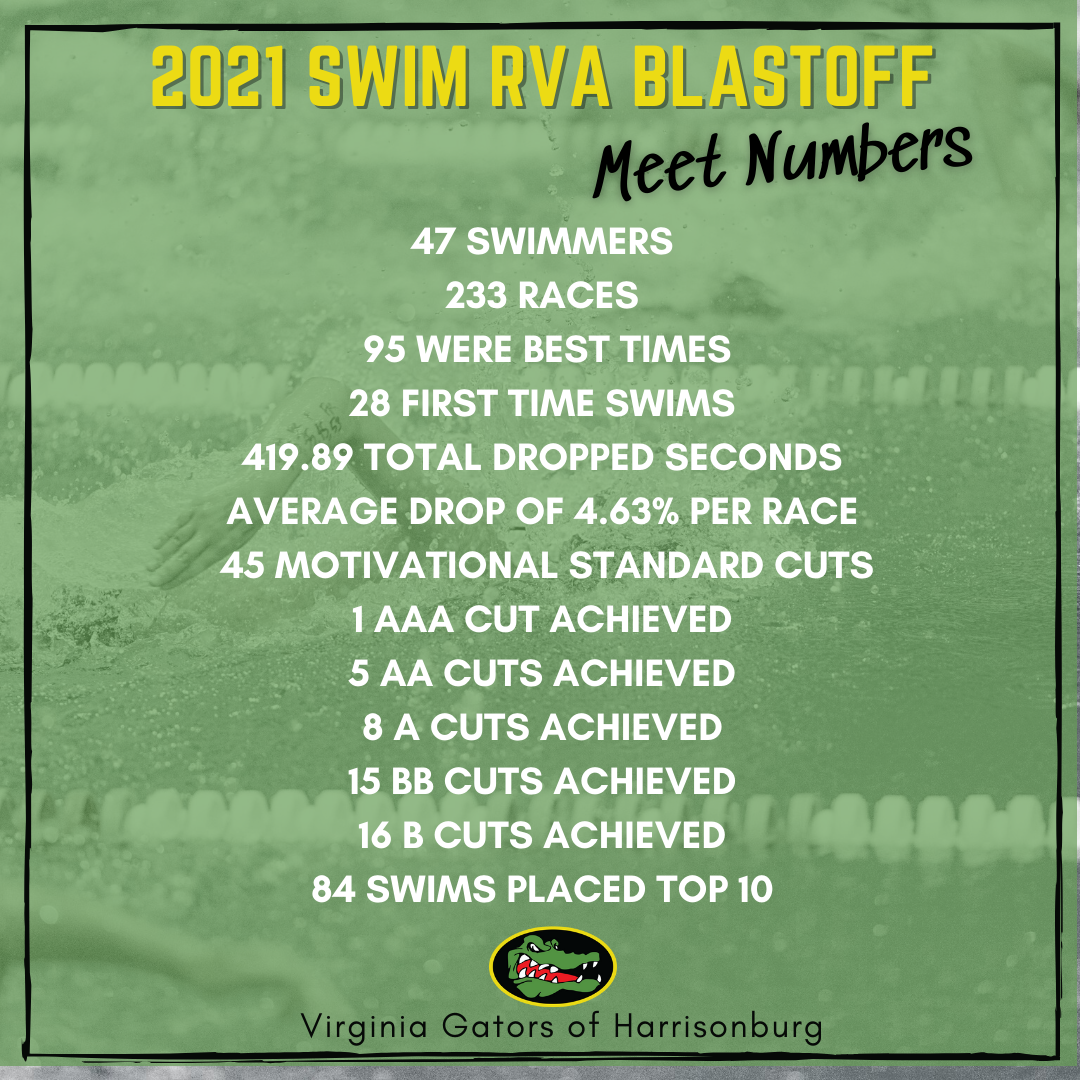 From October 1-3, forty-seven of our swimmers traveled to Richmond, VA for the SwimRVA Blastoff Invitational - a great team turnout for our kids! This was a short course meet held at Collegiate Aquatic Center. Our team swam a total of 233 events over the course of 3 days, and 28 of these races were first time swims and 95 were best times. In addition, a total of 419.89 seconds were dropped!