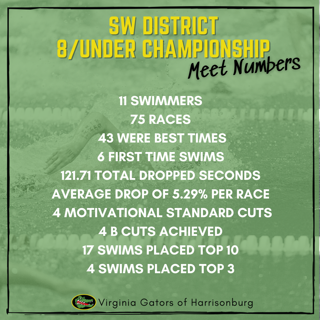 From February 12-13, eleven of our youngest swimmers traveled to Charlottesville for the 2021-22 SW District 8/Under Championship meet, ready to show off all their hard work from this season.