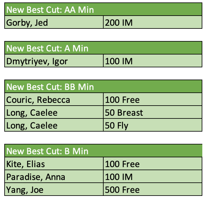 There were seven motivational cuts achieved as well from A through B. Those swims and swimmers are called out below. You all did a great job and congratulations to those who had their first swims as Gators!