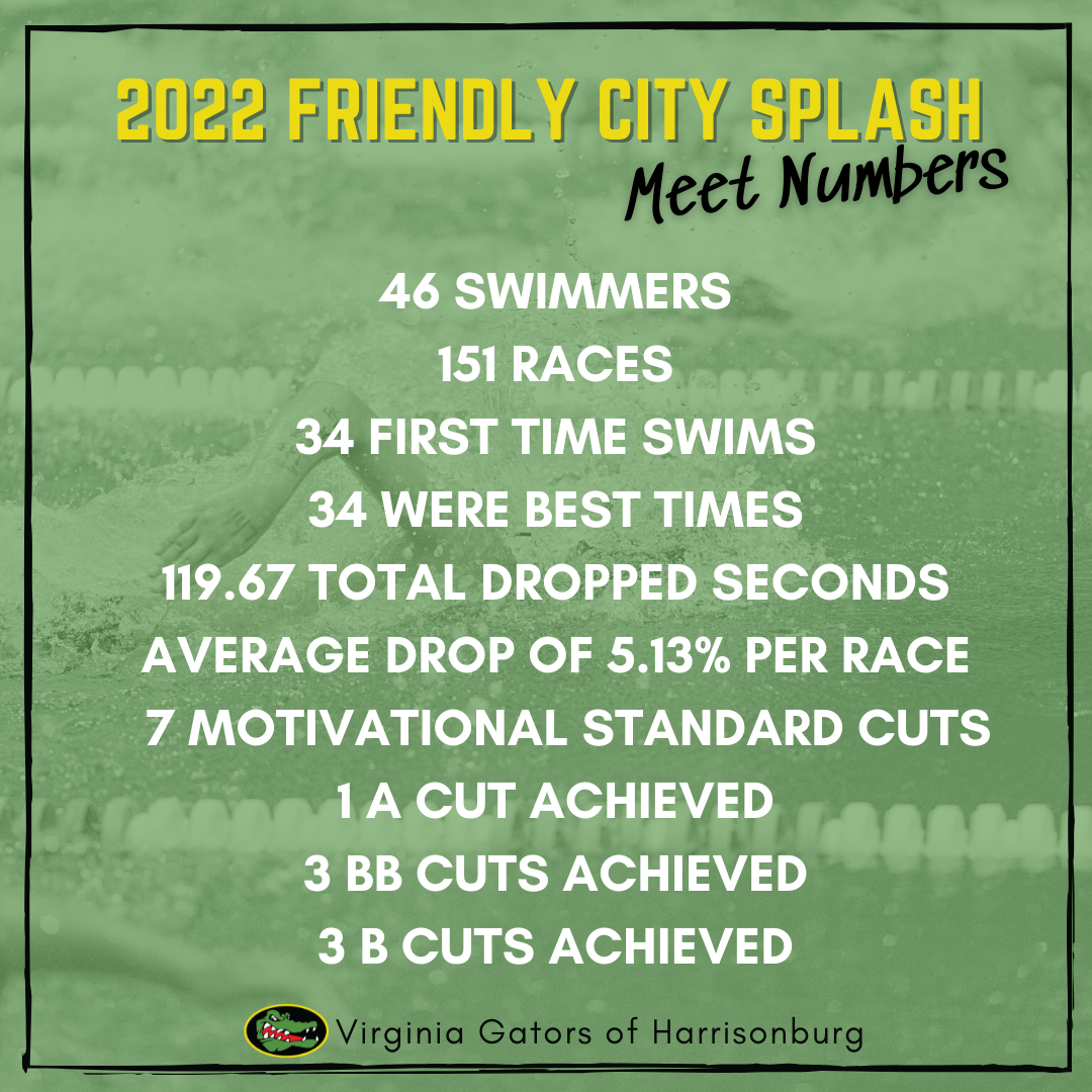 After a last minute rescheduling thanks to some cool temperatures, our team welcomed the Charlottesville Gators along with a few of our clinic swimmers to the Friendly City Splash held at Westover Pool in Harrisonburg.