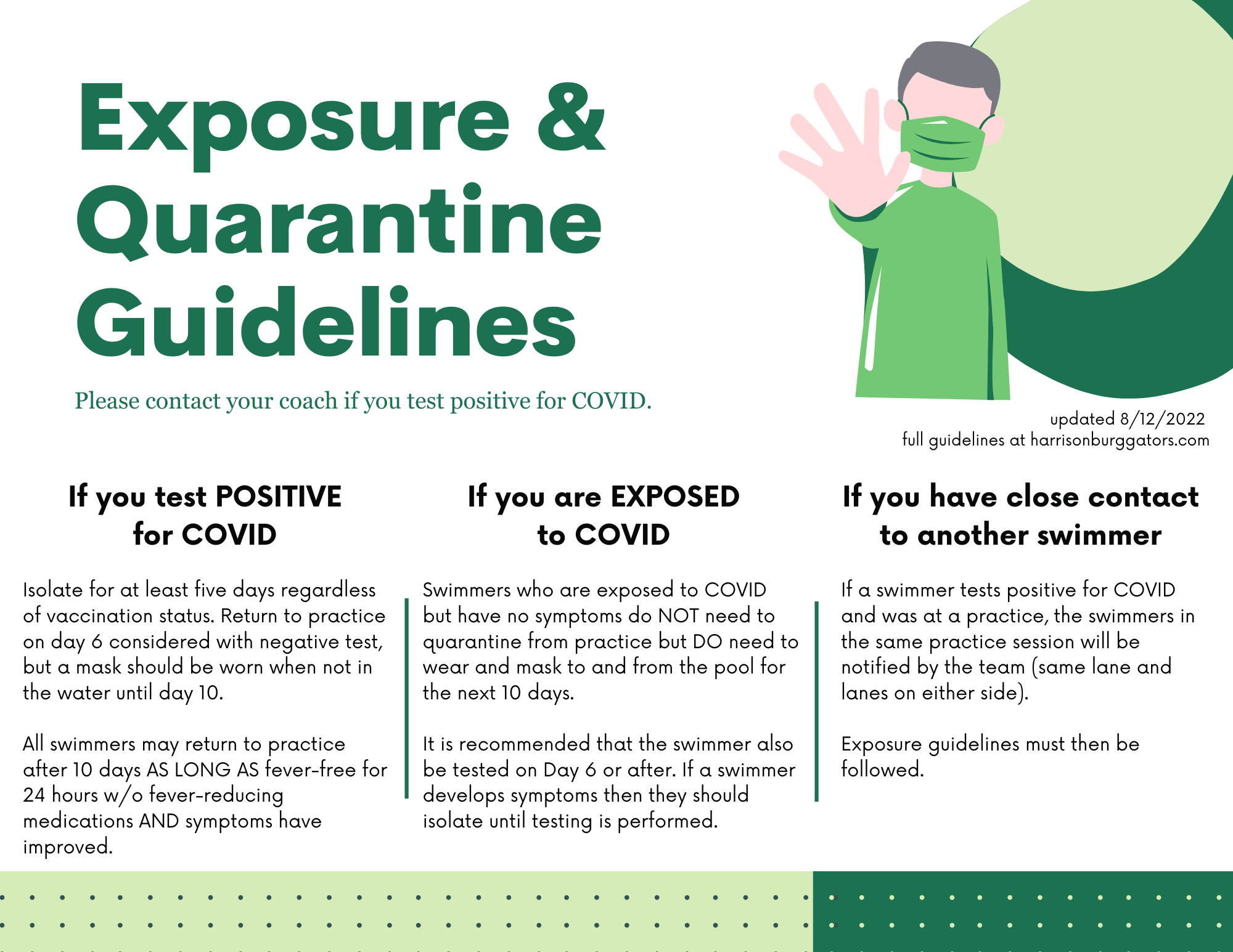 Swimmers who are exposed to COVID but have no symptoms do NOT need to quarantine from practice but DO need to wear and mask to and from the pool for the next 10 days.